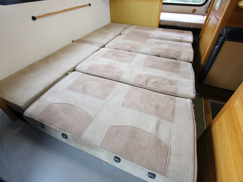 3点式シートベルトで1席分のチャイルドシート設置可能。 残り3席は2点式シートベルト。 写真の奥に2段ベッドがあります。