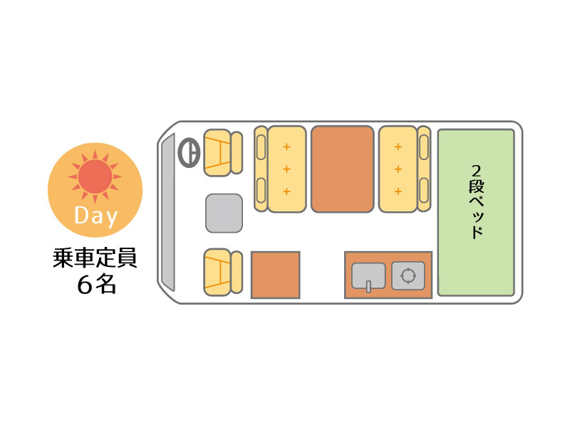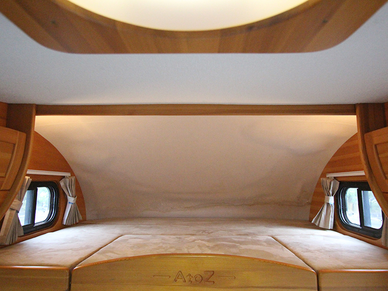 左側がサロン、右側がキッチンと出入口。奥が2段ベッドです。窓が多く明るい車内です。
